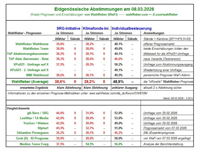 Hier meine fundierte Prognose zu den Ja-Stimmen-Anteilen (in Prozent) bei den eidgenössischen Volksabstimmungen vom 8. März 2026. Sie basiert auf einer breiten Analyse der letzten verfügbaren Umfragen (Stand Ende Februar 2026, Erhebungen ca. 9.–23. Februar) von renommierten Instituten (gfs.bern/SRG-Trendumfrage, YouGov, Tamedia/Leewas) sowie weiteren Prognosen und Einschätzungen von Wahlfieber, 50plus1, MMI-Wahltrend, XPoll21, Sébastien Perseguers, Gradiom, THP-Abstimmungsbarometer, FOEG-Abstimmungsmonitor, Matthias Bürcher, CH-Polit-X und weiteren Analysten/Prädiktionsmärkten.