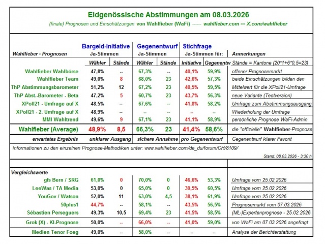 "In der Schweiz finden am 08.03.2026 mehrere Eidgenössische Volksabstimmungen statt. Konkret soll das Wahlvolk abstimmen über folgende Vorlagen: die SRG-Initiative, die Klimafonds-Initiative, das Bundesgesetz zur Individualbesteuerung sowie die Bargeld-Initiative und deren direkter Gegenentwurf. Bzgl. der Bargeld-Initiative findet zudem eine Stichfrage statt, falls beide Vorlagen angenommen werden sollten. - Kannst du mir konkret benennen, wie viele Ja-Stimmen in Prozent die einzelnen Abstimmungen vermutlich erhalten werden und wie die bereits genannte Stichfrage in Prozenten ausgehen könnte? Mir ist dabei wichtig, konkrete Prozentzahlen zu erhalten. - Berücksichtige bei deiner Analyse bitte nicht alleine die Umfrageinstitute (gfs Bern, Leewas, YouGov), sondern auch weitere Prognosen und Einschätzungen alternativer Anbieter und Institute - z.B. Wahlfieber (incl. Wahlfieber Average, Wahlfieber Wahlbörsen, Wahlfieber Team), 50plus1, XPoll21 – Umfragen auf X, Sebastien Perseguers, Gradiom.ch, MMI-Wahltrend, ThP-Abstimmungsbarometer, foeg-Abstimmungsmonitor, Matthias Bürcher, CH-Polit-X sowie weitere Prognostiker."