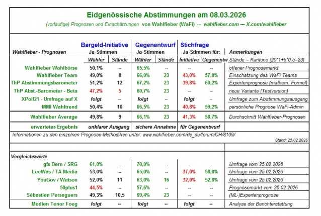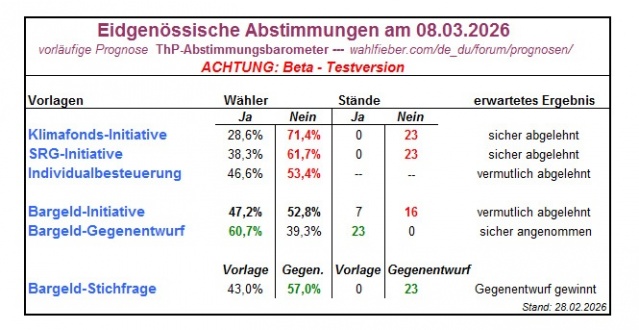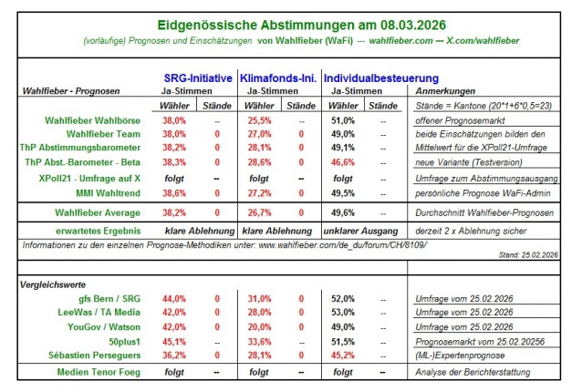 Die vorläufigen Prognosen für die eidgenössischen Abstimmungen am 08.03.2026.