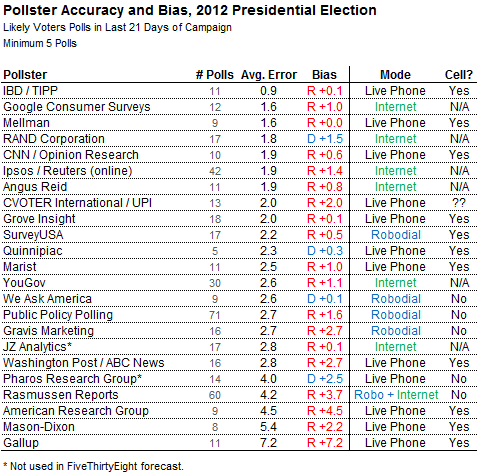 Kann man vielleicht am ehesten hier unterbringen: Der Erfolg der verschiedenen Umfrageinstitute, sowohl in Bezug auf die durchschnittliche Abweichung vom schlussendlichen Wahlergebnis als auch beim Ausschalten einer regelmäßigen Abweichung zugunsten einer der beiden Parteien (meist der Republikaner). Die Internet-Pollster, im UK schon länger eine etablierte Größe, sind jetzt auch in den USA angekommen, einige Firmen haben recht gut abgeschnitten mit dieser Methode, ich war da vor der Wahl noch etwas skeptisch gewesen. Demoskopen, die echte Interviews (keine Robocalls) durchführen ließen, finden sich sowohl ganz oben als auch ganz unten; wer Handys anrief, gelangte auf diese Weise nicht unbedingt zu einem besseren Ergebnis. Und ja: Gallup, Erfinder der Umfragen in ihrer heutigen Form, sowie Rasmussen sind tief gefallen.