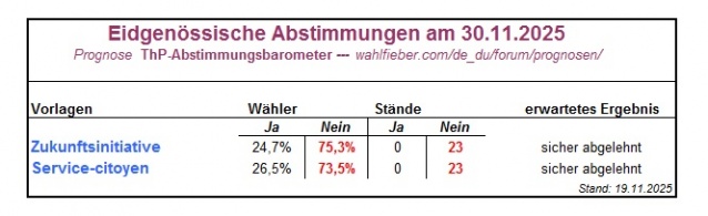 dies sind unsere vorläufigen Prognosen für die zwei eidgenössischen Abstimmungen am 30.11.2025.