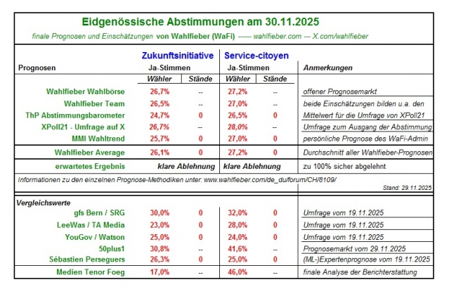 Alle wichtigen Prognosen für die Abstimmungen am kommenden Sonntag auf einen Blick (Stand: 22.11.2025):