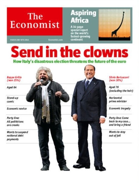 Journalisten haben es halt besser: Können elegant von heute auf morgen die Meinung ändern; die BILD schwadroniert Anfang der Woche über die italienischen "Clowns" und fragt heute besorgt, ob einer wie Steinbrück noch tragbar sei. Und ist der Economist nicht mehr ernstzunehmen, wenn er mit diesem Titel erscheint?